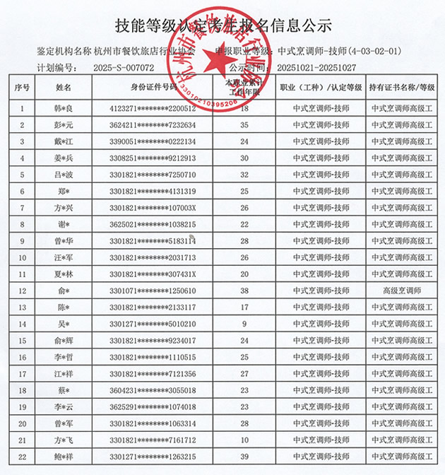 杭州市餐饮旅店行业协会开展中式烹调师技师(二级)技能等级认定,经报名确认、条件审核后共有22人符合条件,予以报名公示(具体名单详见附件)。公示期2025年10月21日至10月27日,如有异议,请在公示期内,以书面形式进行实名反映(以邮戳日期为准)。 通讯地址:杭州市西湖区玉古路188号现代国际大厦A座802室,邮编310063;受理单位:杭州市餐饮旅店行业协会,联系电话:87243090。